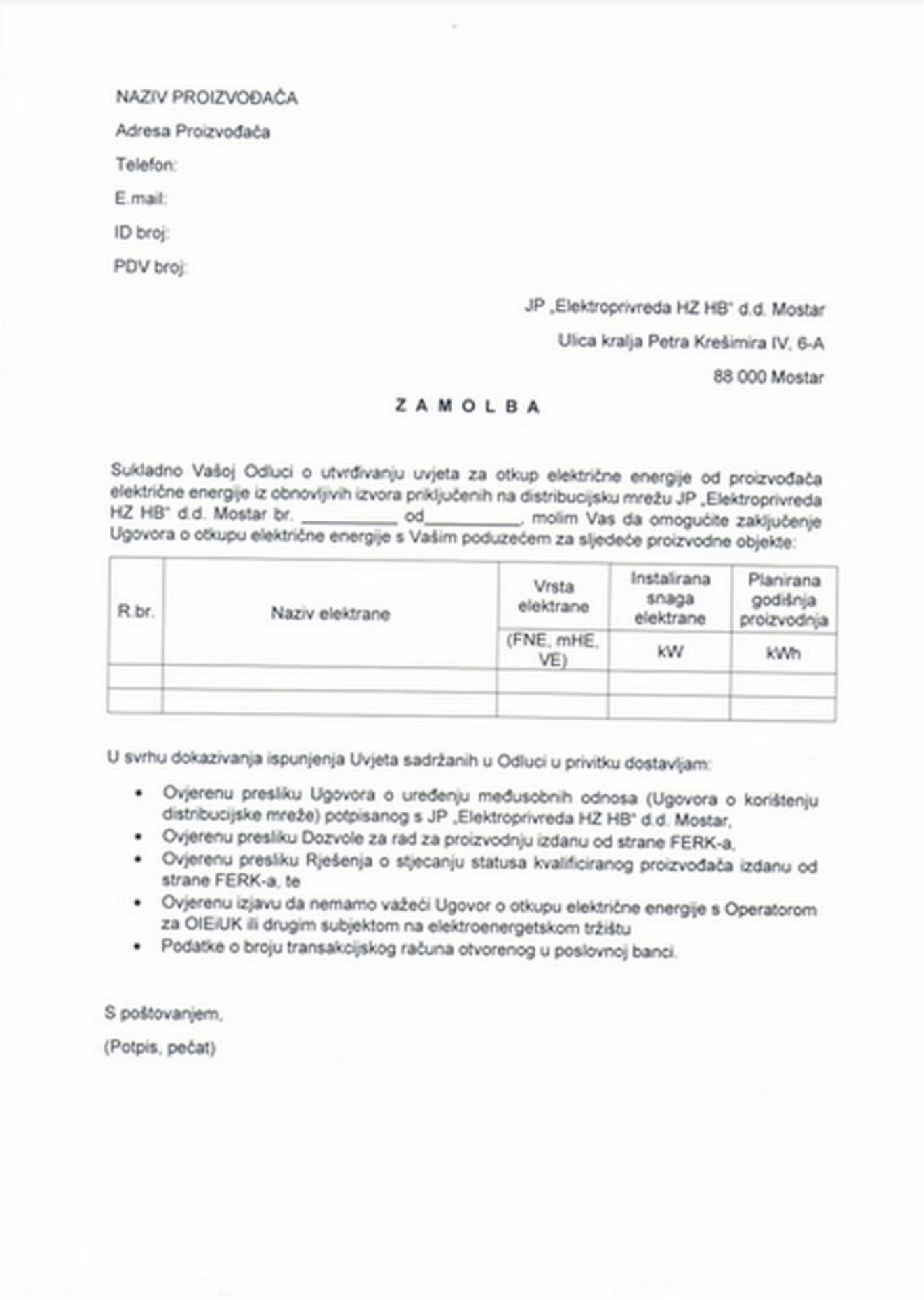 Inicijativu za potpisivanje ugovora s JP „Elektroprivreda HZ HB“ d.d. Mostar podnosit će proizvođači, uz podnošenje dokaza o ispunjavanju uvjeta.